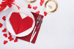 Valentinas day table setting white color with white silverware, red napkin folded as heart, candles, champagne, glasses on white background for greetings. Romantic dinner or menu concept. Mock up.